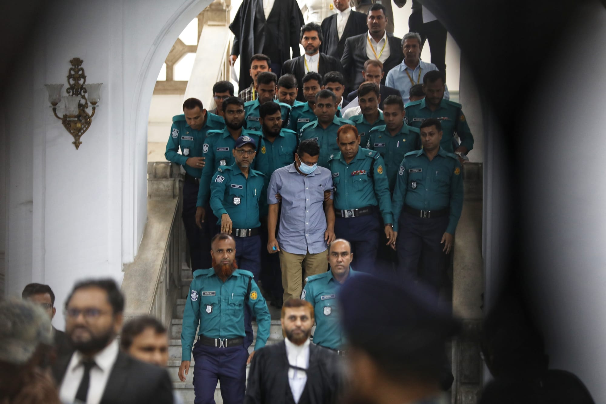 Chowdhury Abdullah Mamun, the former chief of police, is being escorted to court. VIDEO: Marzia Hashmi Momo/Netra News