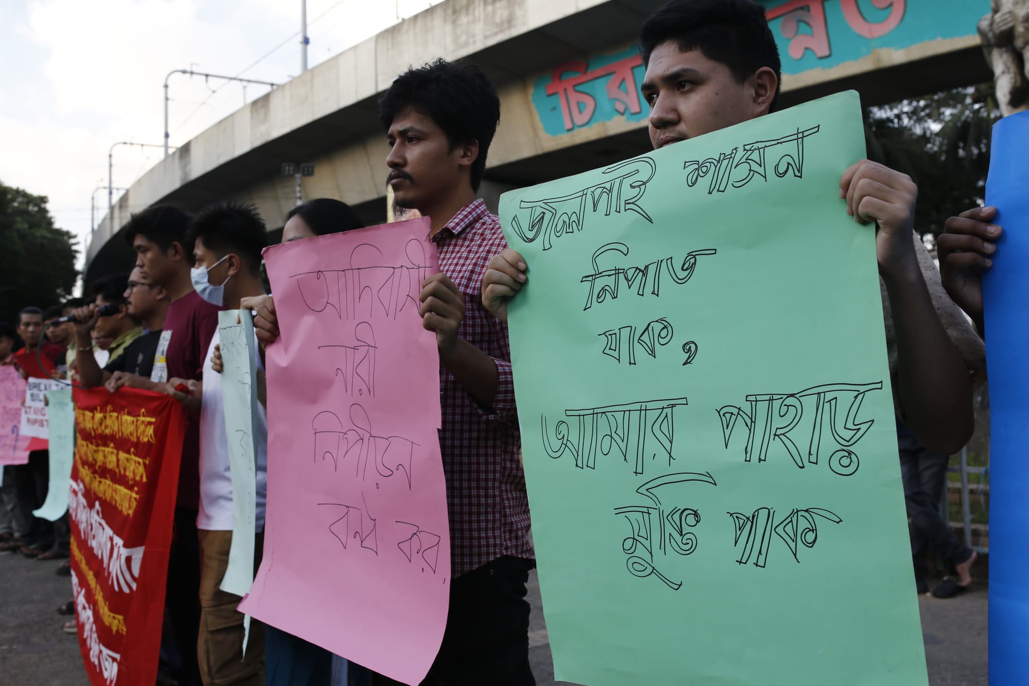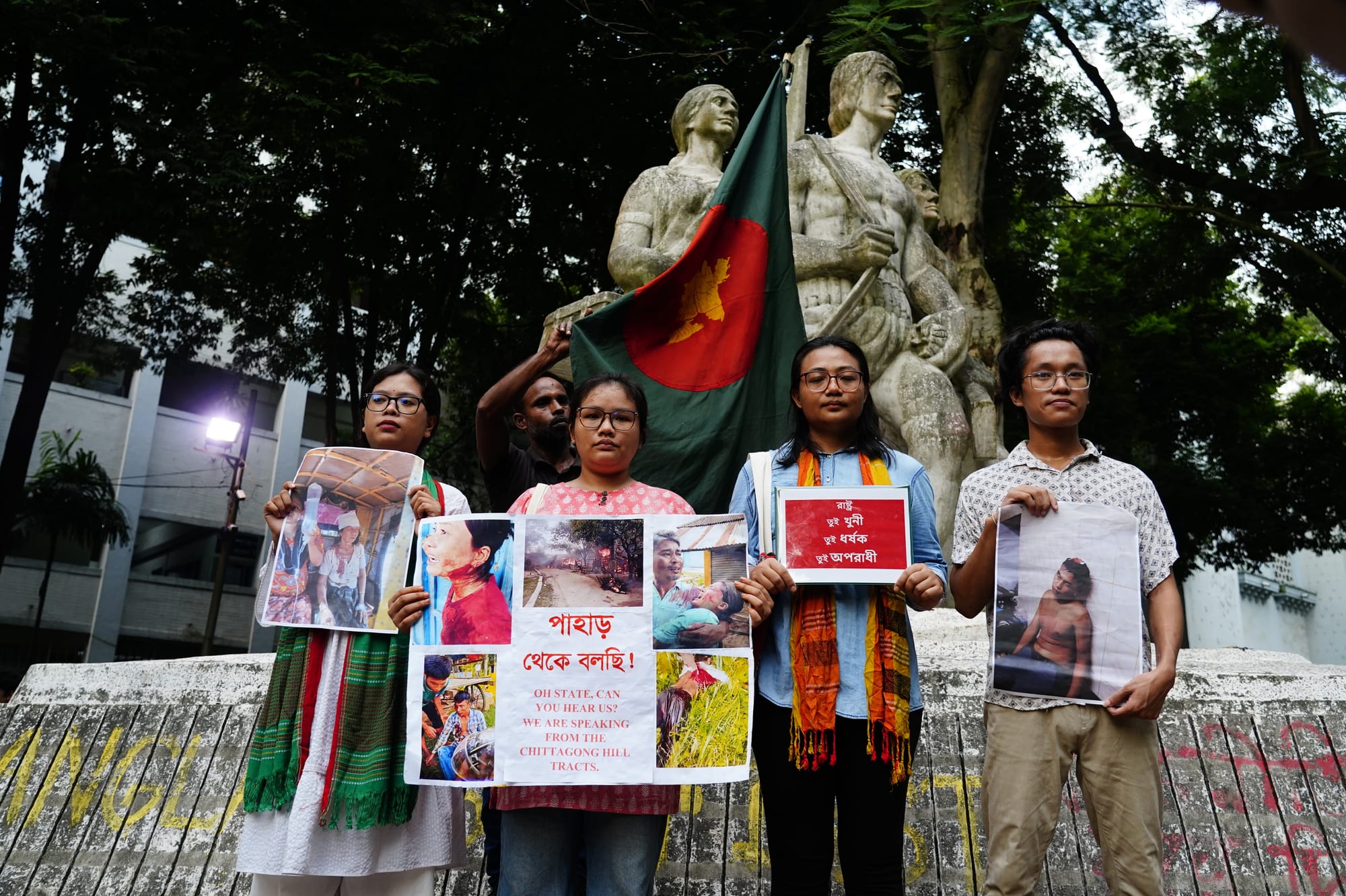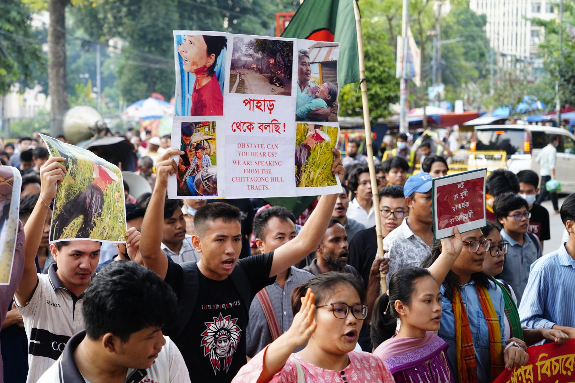 September 28, 2025. Indigenous students and rights activists marched at Dhaka University's Aparajeyo Bangla, Shahbagh, and the TSC area of the capital to protest the killing of three indigenous people by gunfire. Photo: Denim Chakma/Netra News