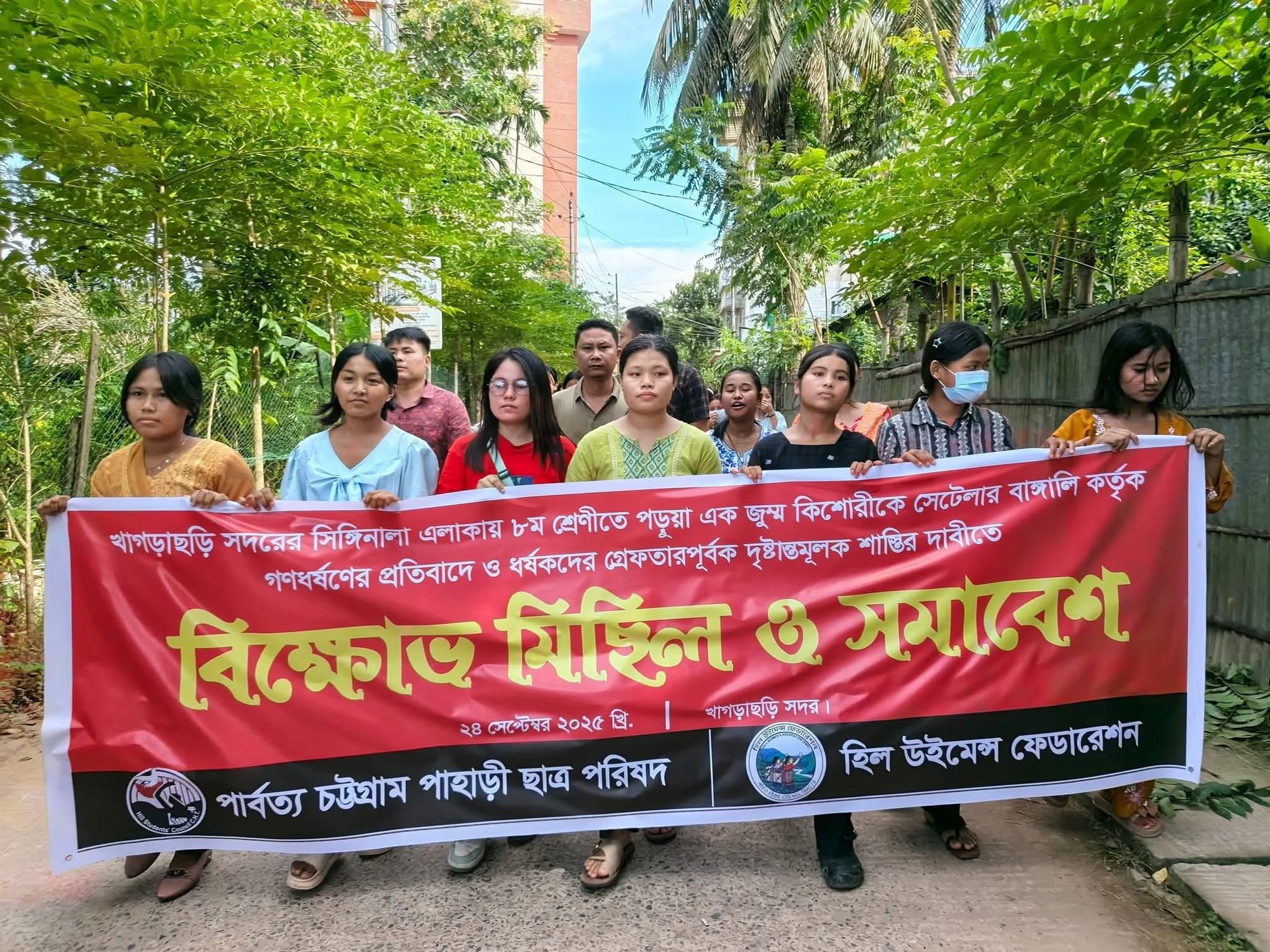 September 24, 2025: Parbatya Chattogram Pahari Chatra Parishad (PCP) and Hill Women's Federation (HWF) held a protest procession and rally in Rangamati Sadar. Photo: Denim Chakma/Netra News