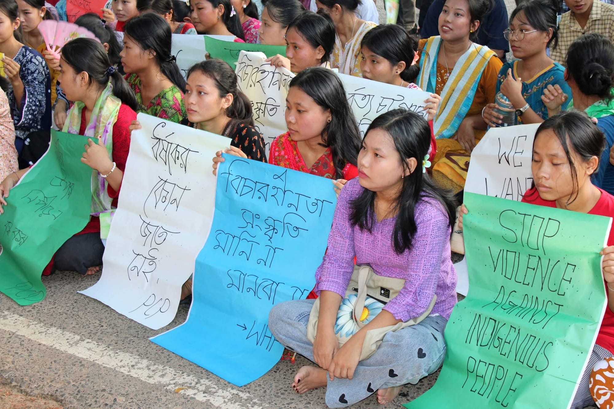 September 24, 2025: Local indigenous women took to the streets in Khagrachari Sadar to protest the rape of an 8th-grade Marma girl and demand the arrest of the culprits. Photo: Denim Chakma/Netra News