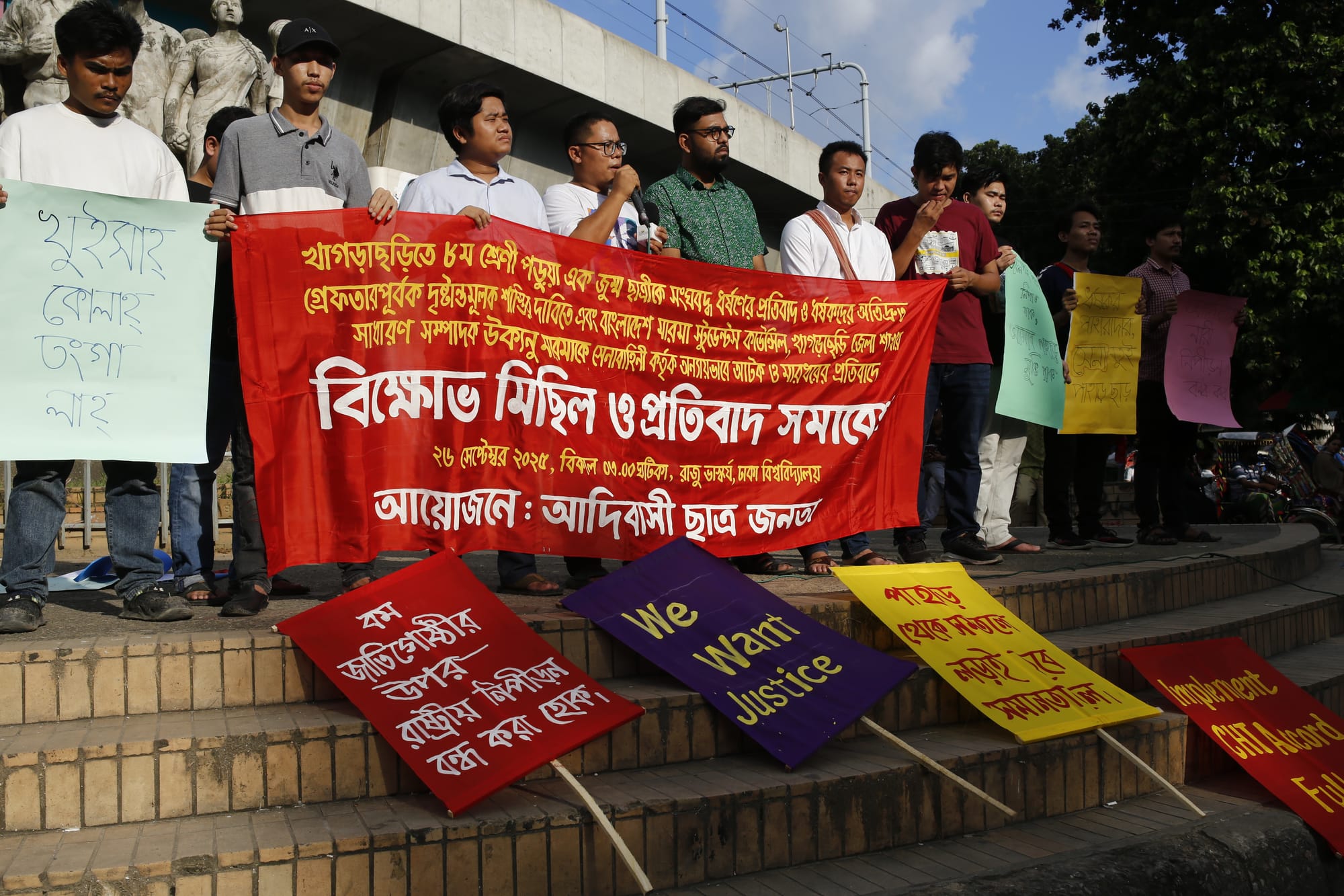 September 26, 2025. Adibashi Chatra Jonota held a protest rally in front of the Raju Memorial Sculpture, located near Dhaka University, chanting the slogan, “We Want Justice.”