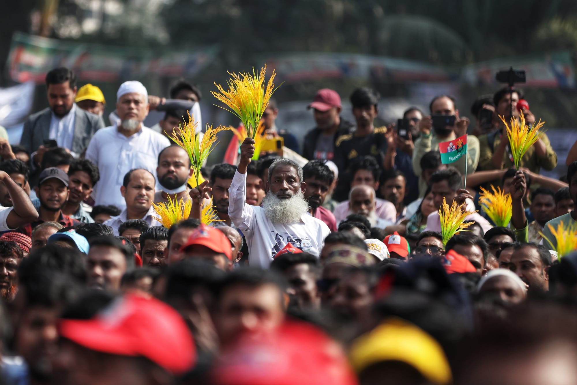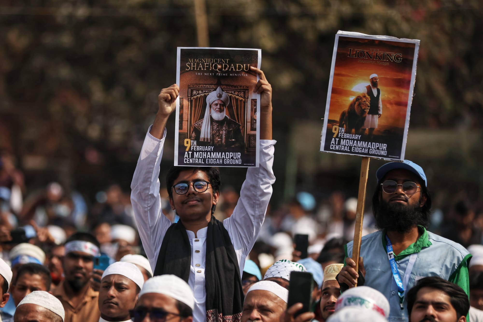Young Jamaat-e-Islami supporters carry posters likening the party’s chief to lionised cinematic heroes, while a BNP rally draws a lower-income crowd. Photo: Jibon Ahmed/Netra News