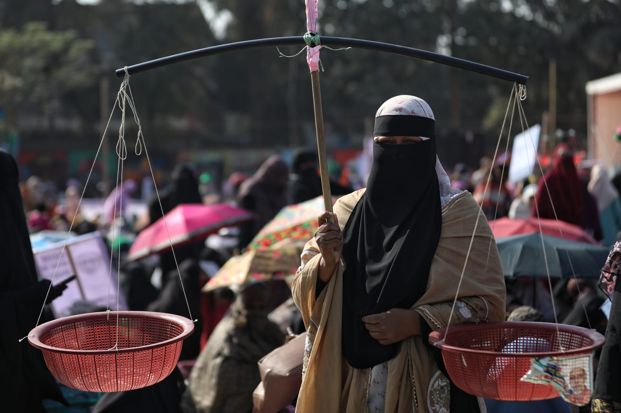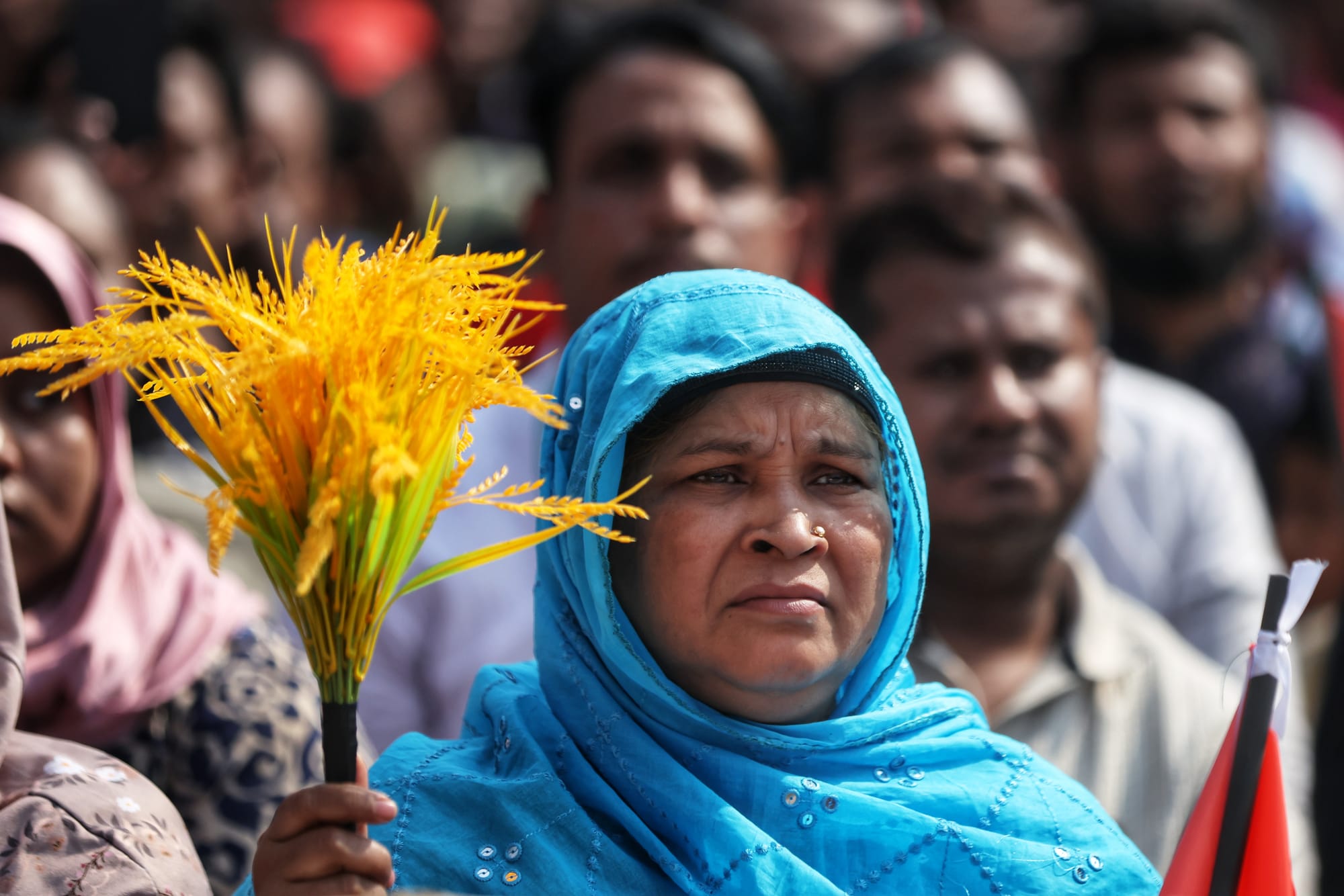 Women attend political rallies displaying Jamaat-e-Islami’s electoral symbol, the scales, alongside the BNP’s sheaf of paddy. Photo: Jibon Ahmed/Netra News