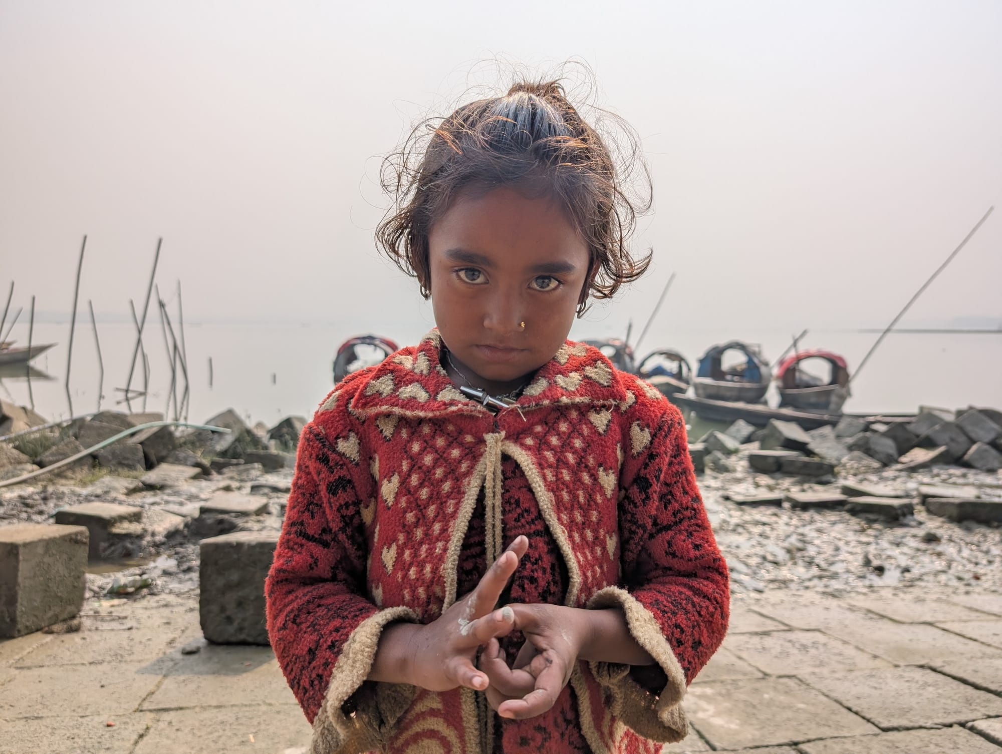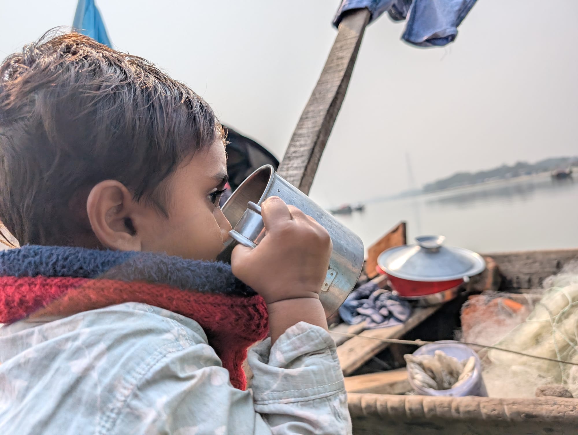The Manta children’s first steps are taken on the narrow decks of the boats. Once a Manta child learns to toddle, the parents’ fear grows thicker. To safeguard them, parents tie a jhunjhuni (a small bell) to the children’s wrists, waists, or ankles with a rope. But that is not always enough. Ilias Manta, a father who lost his three-year-old child, told me how he still lives in constant fear for the life of his remaining daughter. The river took his son’s life three years ago.
