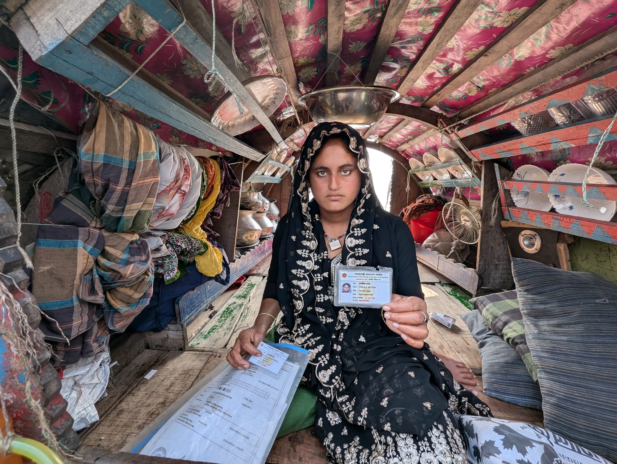 During the sweltering heat of summer, the husband tends to sleep on the open deck while the wife and children stay indoors, meaning under the chhoi (the woven bamboo structure forming a roof, arched over the middle of the boat). And during the monsoon season, the Manta family cannot light their stove to cook, often forcing them to go without food. 39-year-old Rashida Manta described winter as bitter and cold. She said, “We don’t even receive a single blanket [from the government].”